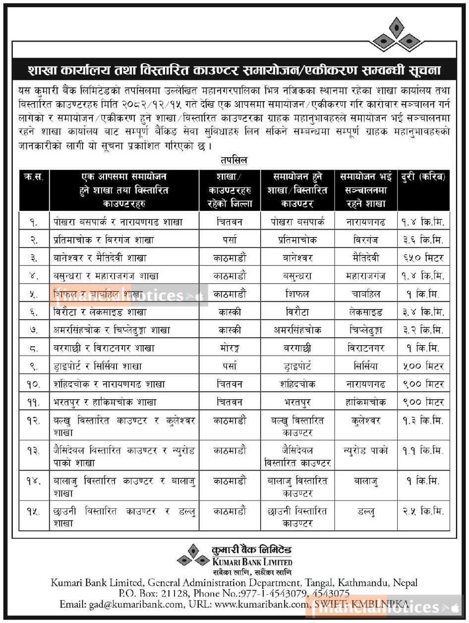 कुमारी बैंकको विभिन्न शाखा कार्यालय तथा काउण्टरहरु गाभिने सम्बन्धी सूचना