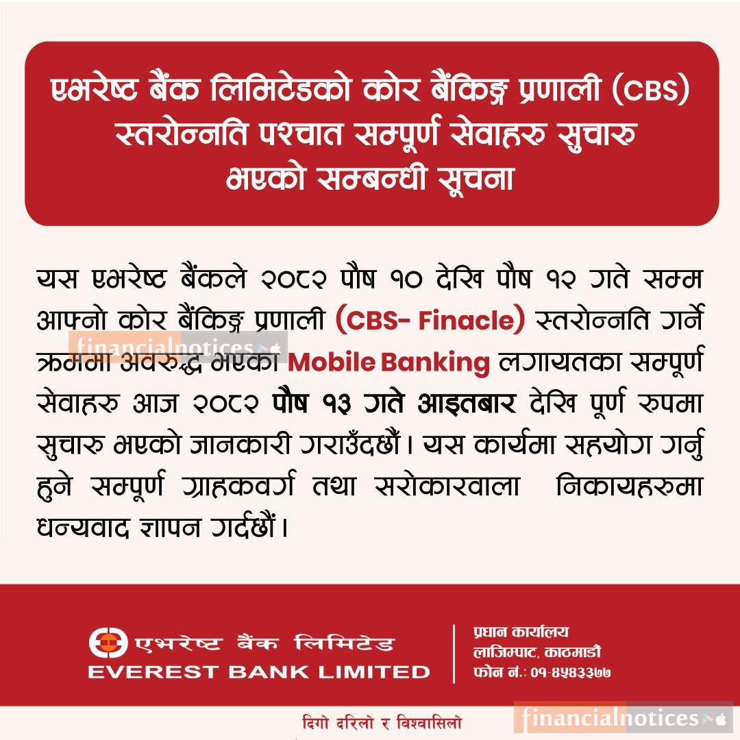 एभरेष्ट बैंकको सम्पुर्ण सेवाहरु सूचारु भएको सम्बन्धी सूचना