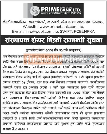 प्राइम कमर्सियल बैंकको संस्थापक शेयर बिक्री सम्बन्धी सूचना