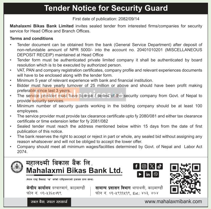 Mahalaxmi Bikas Bank Limited has invited sealed tenders from eligible and experienced companies to provide security guard services for its Head Office and branch offices. Interested firms must meet the required legal, financial, and professional criteria as specified in the tender document. The completed sealed bids should be submitted within 15 days from the date of first publication. The bank reserves the right to accept or reject any or all bids without assigning any reason.