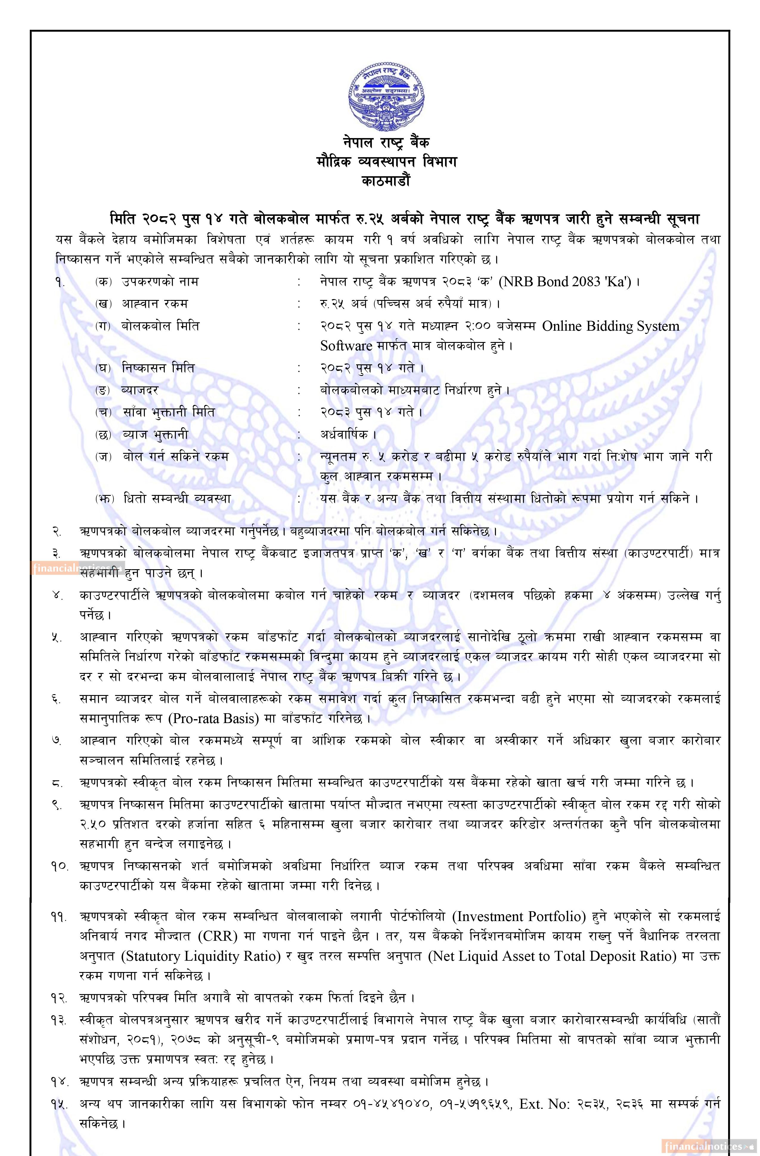 नेपाल राष्ट्र बैंकले पुस १४ गते २५ अर्ब रुपैयाँ बराबरको एक वर्षे अवधिको ऋणपत्र निष्कासन गर्ने भएको छ।