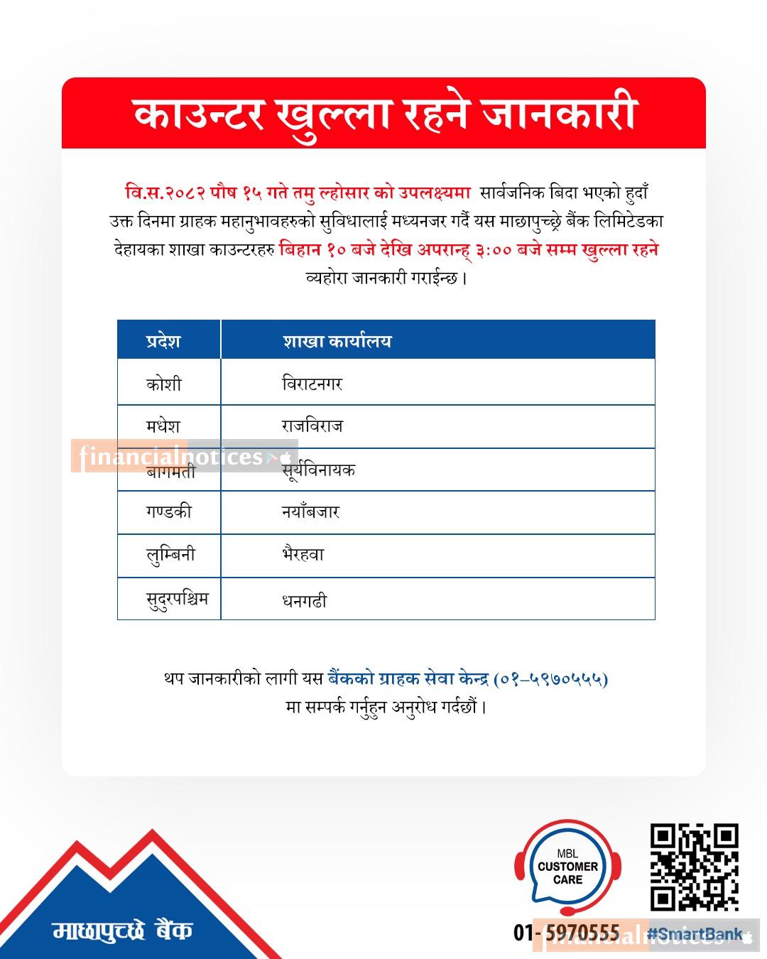 तमु ल्होसारको दिन माछापुच्छ्रे बैंकको काउण्टरहरु खुल्ला रहने बारे सूचना