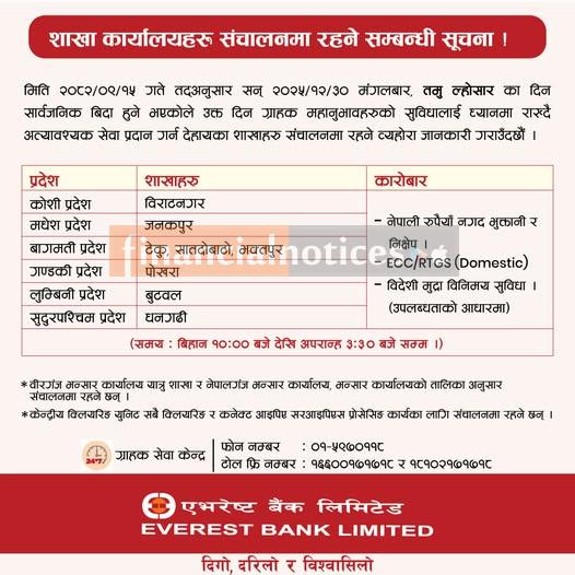 सार्वजानिक विदाको दिन पनि बैंकको विभिन्न शाखा कार्यालयहरु संचालनमा रहने सम्बन्धी सूचना