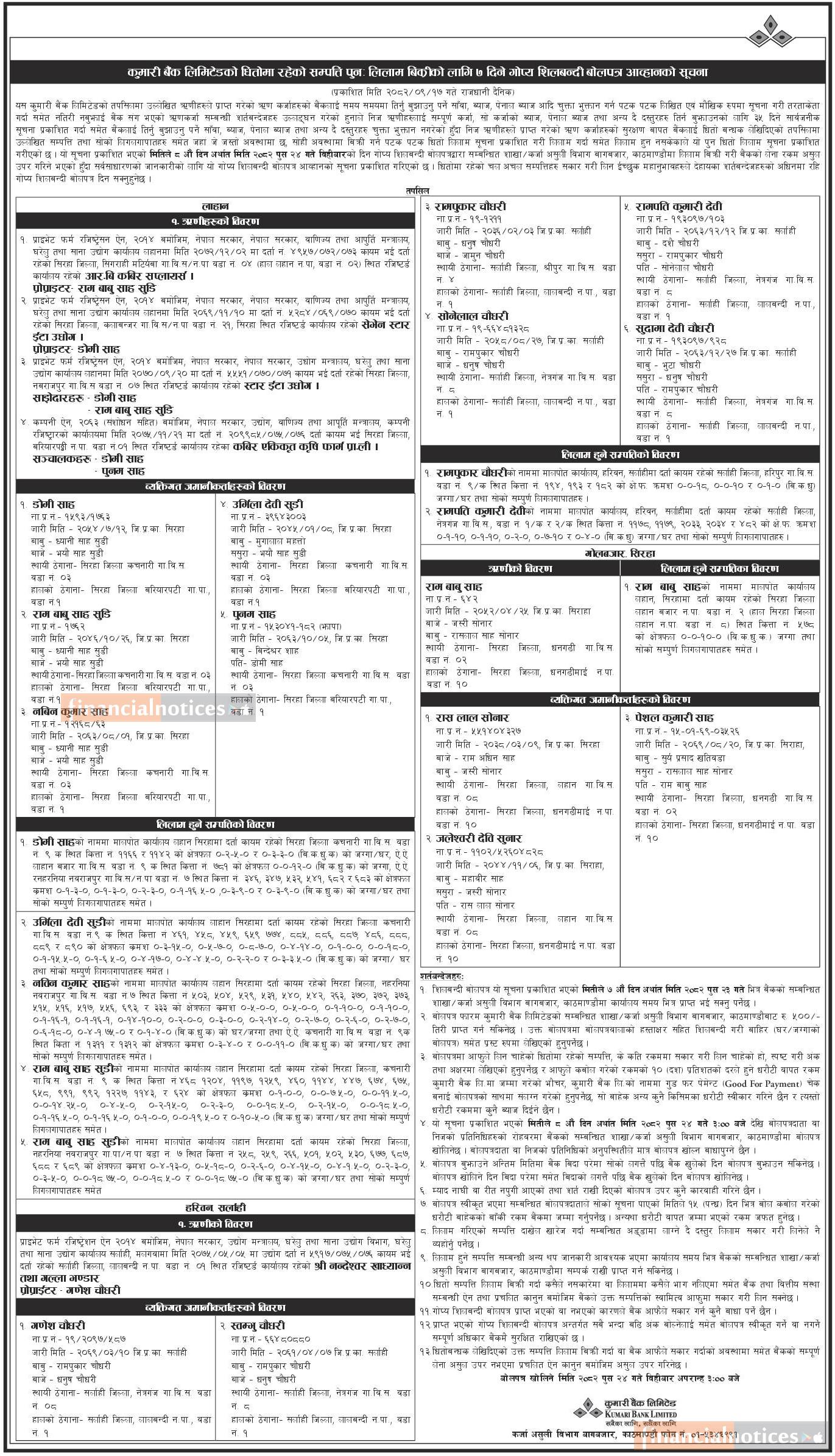 कुमारी बैंकको धितोमा रहेको सम्पत्ति पुनः लिलाम बिक्रीको सात दिने सूचना -