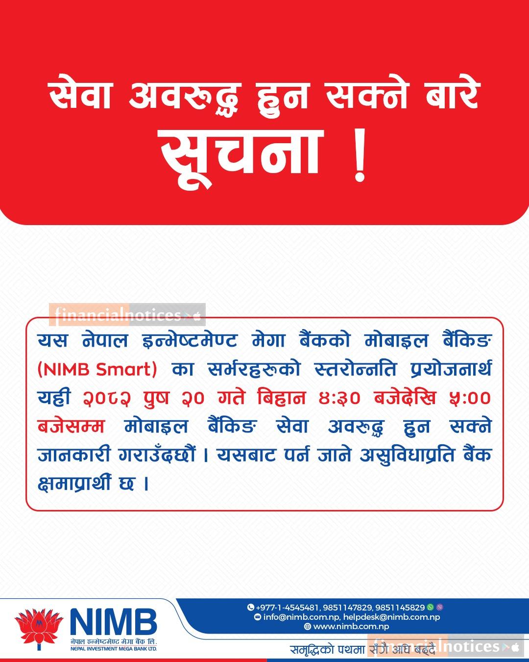 बैंकिङ सेवा अवरुद्ध हुने बारे नेपाल इन्भेष्टमेन्ट मेगा बैंकको महत्वपूर्ण सूचना -