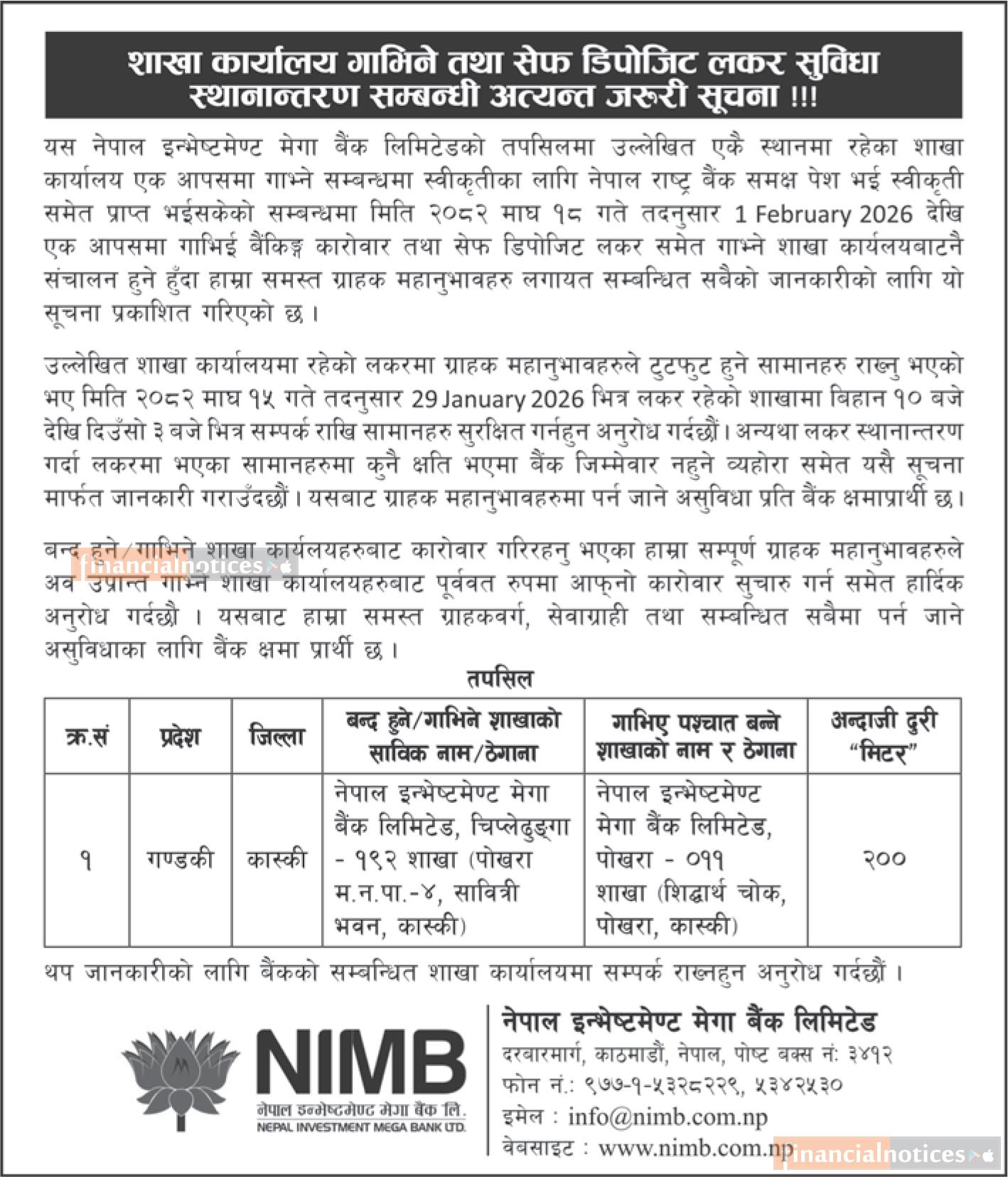 शाखा कार्यालय गाभिने तथा सेफ डिपोजिट लकर स्थानान्तरण सम्बन्धी अत्यन्त जरुरी सूचना