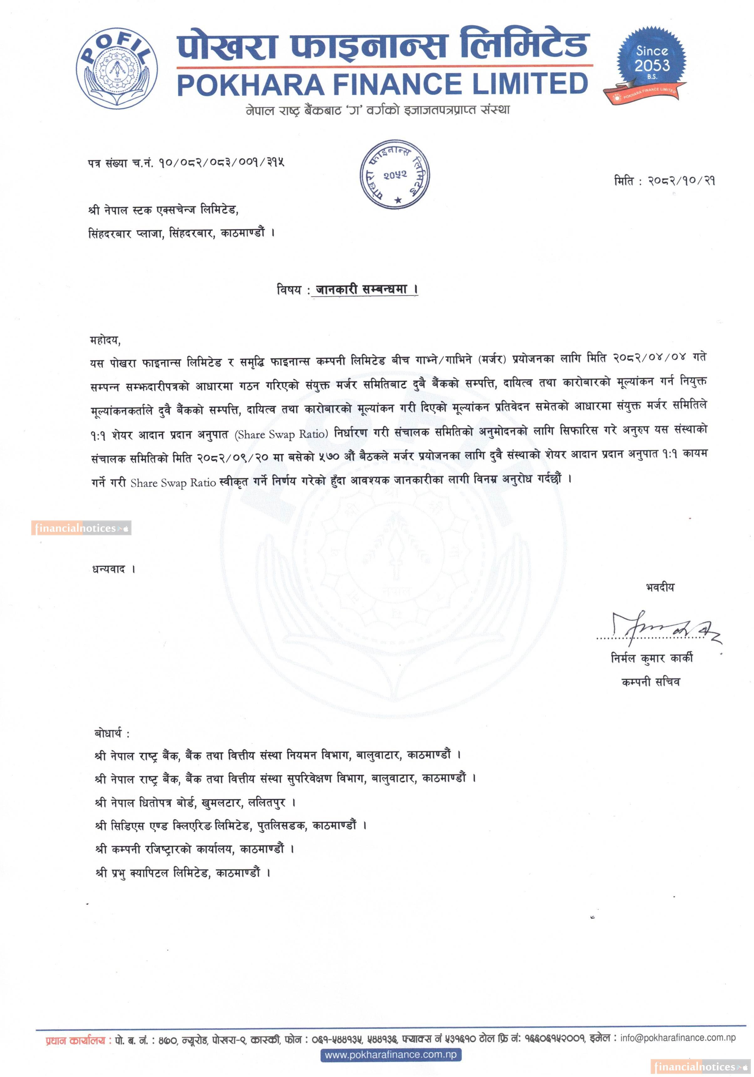 पोखरा र समृद्धि फाइनान्स बीच मर्जरपश्चात स्वाप रेसियो बराबर कायम हुने सम्बन्धी सूचना