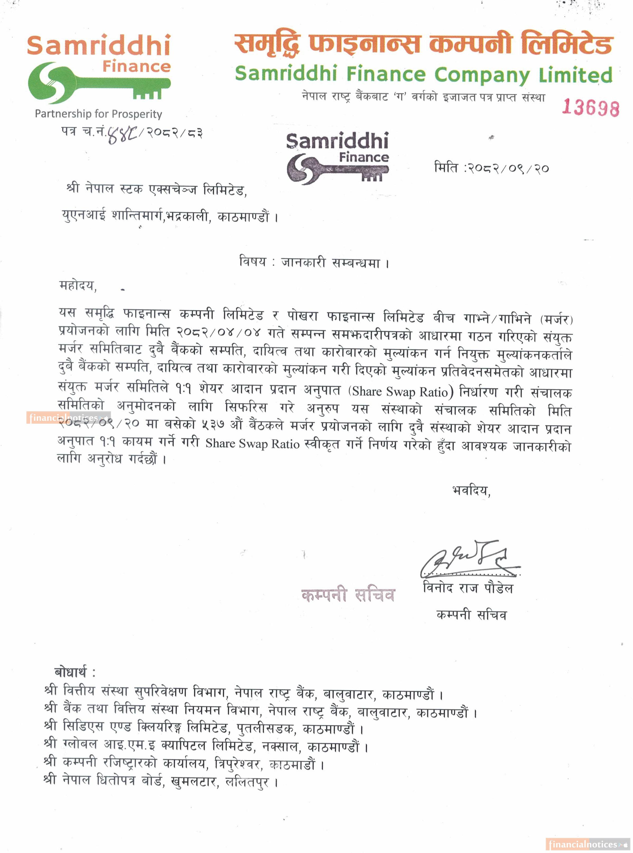 मर्जरपश्चात स्वाप रेसियो बराबर कायम हुने सम्बन्धी सूचना