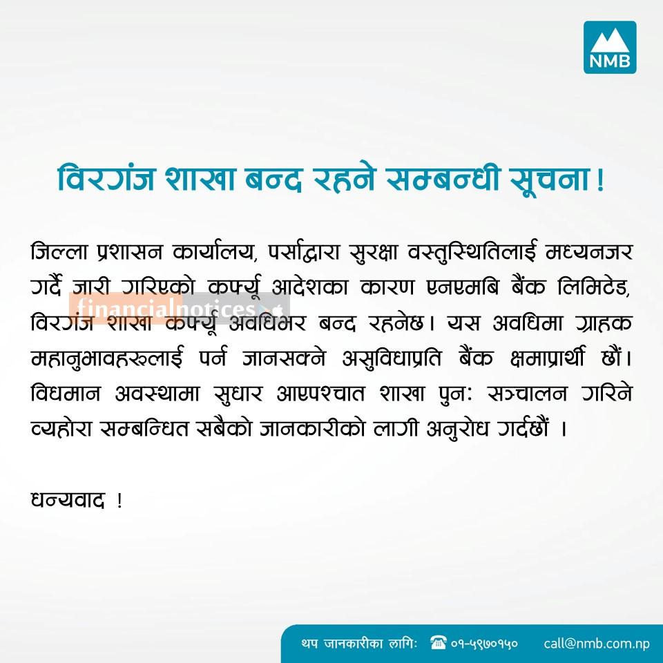 एनएमबि बैंकको शाखा कार्यालय बन्द रहने सम्बन्धी सूचना