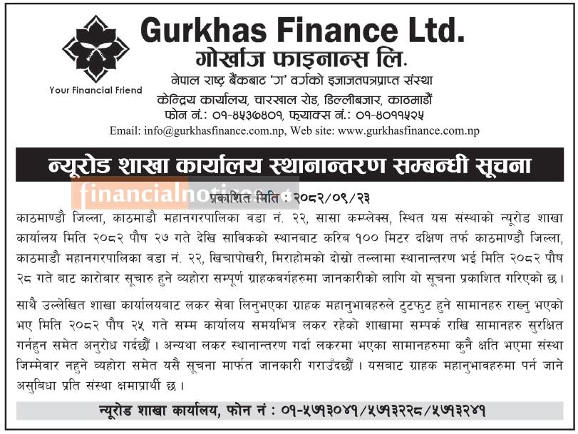 गोर्खाज फाइनान्सको शाखा कार्यालय स्थानान्तरण सम्बन्धी सूचना