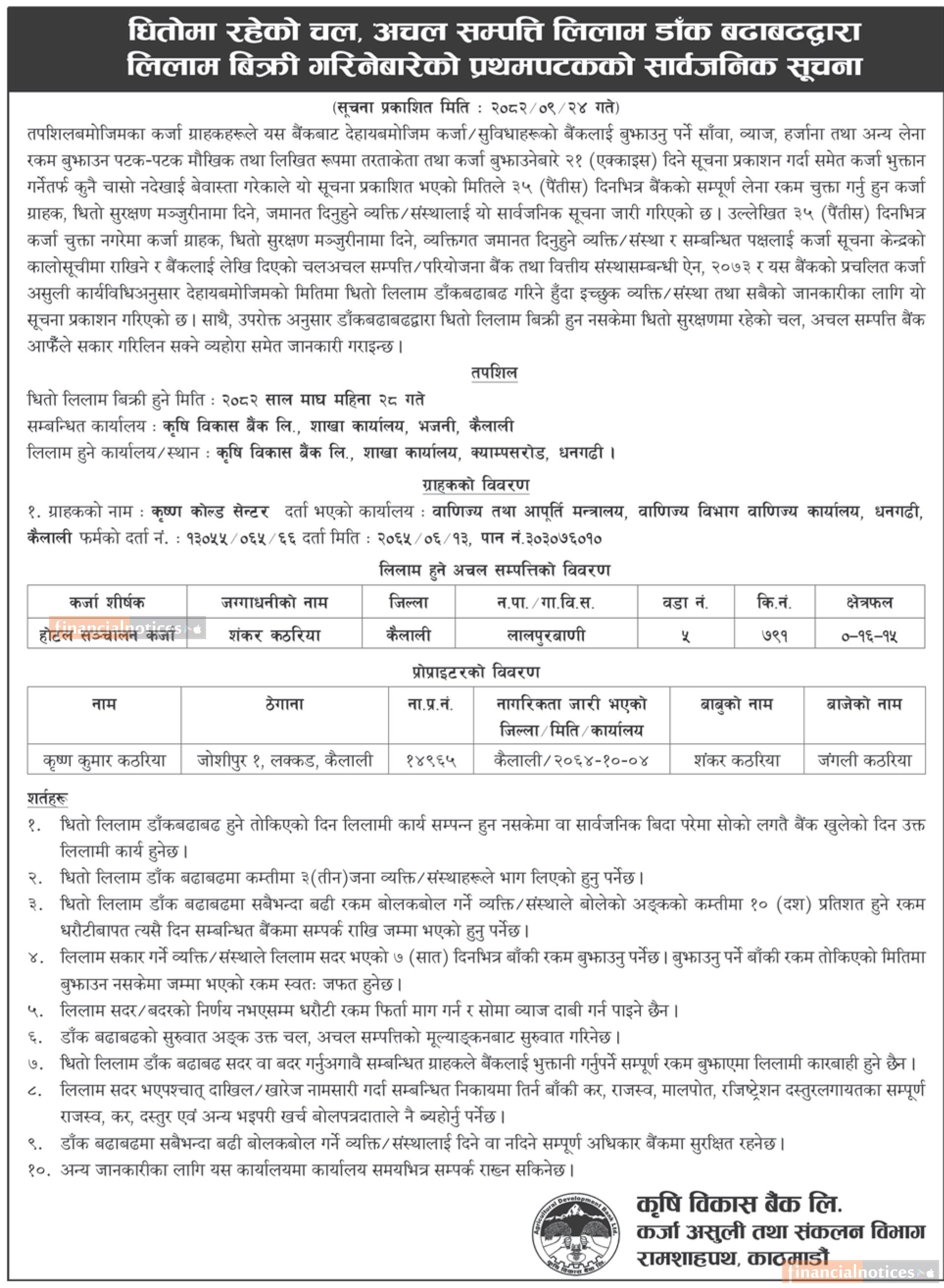 Kumari Bank Auction Notice for Non-Banking Assets at Mahendranagar, Kanchanpur -