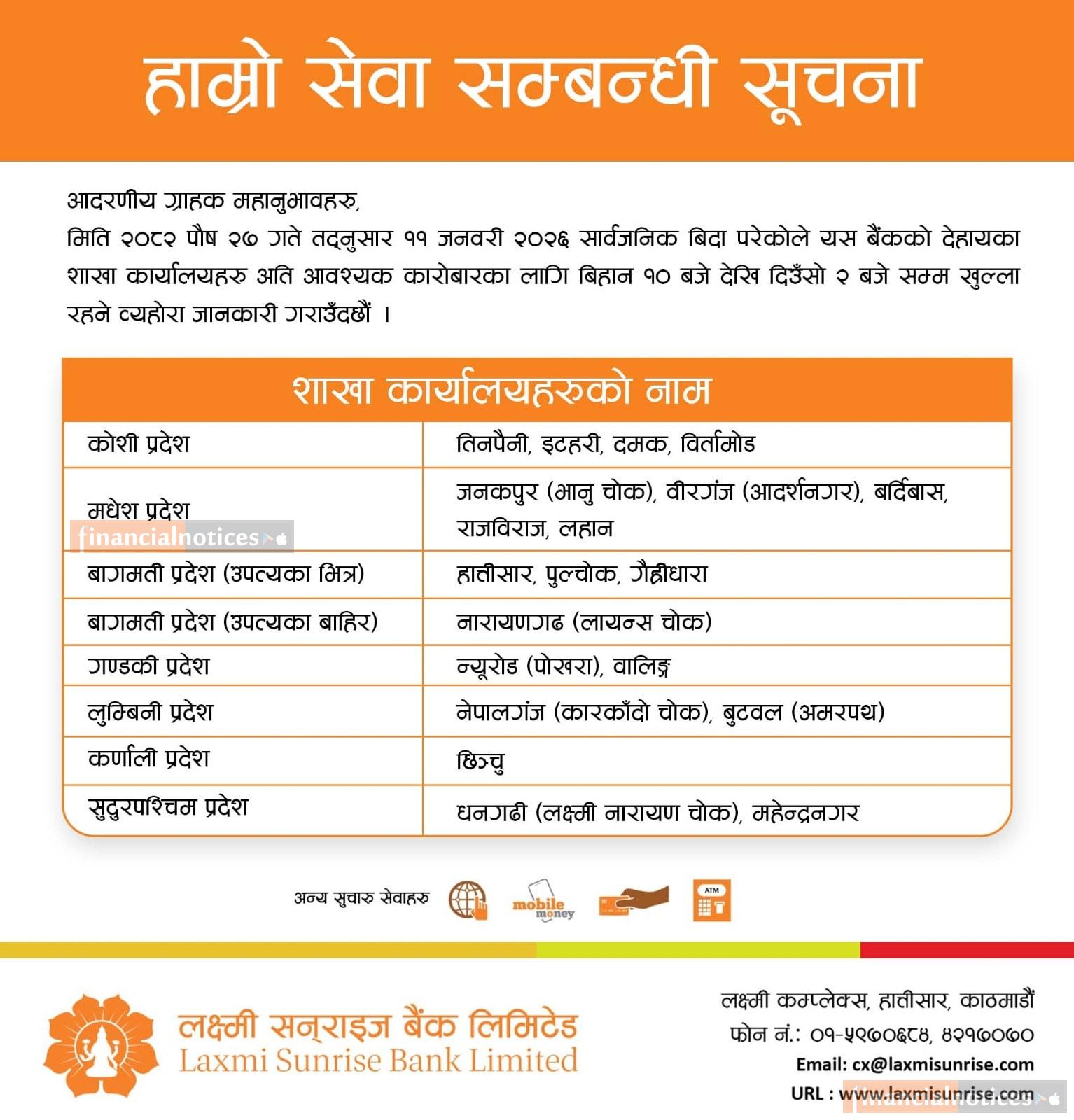 लक्ष्मी सनराइज बैंकको विभिन्न शाखाहरु खुल्ला रहने सम्बन्धी सूचना