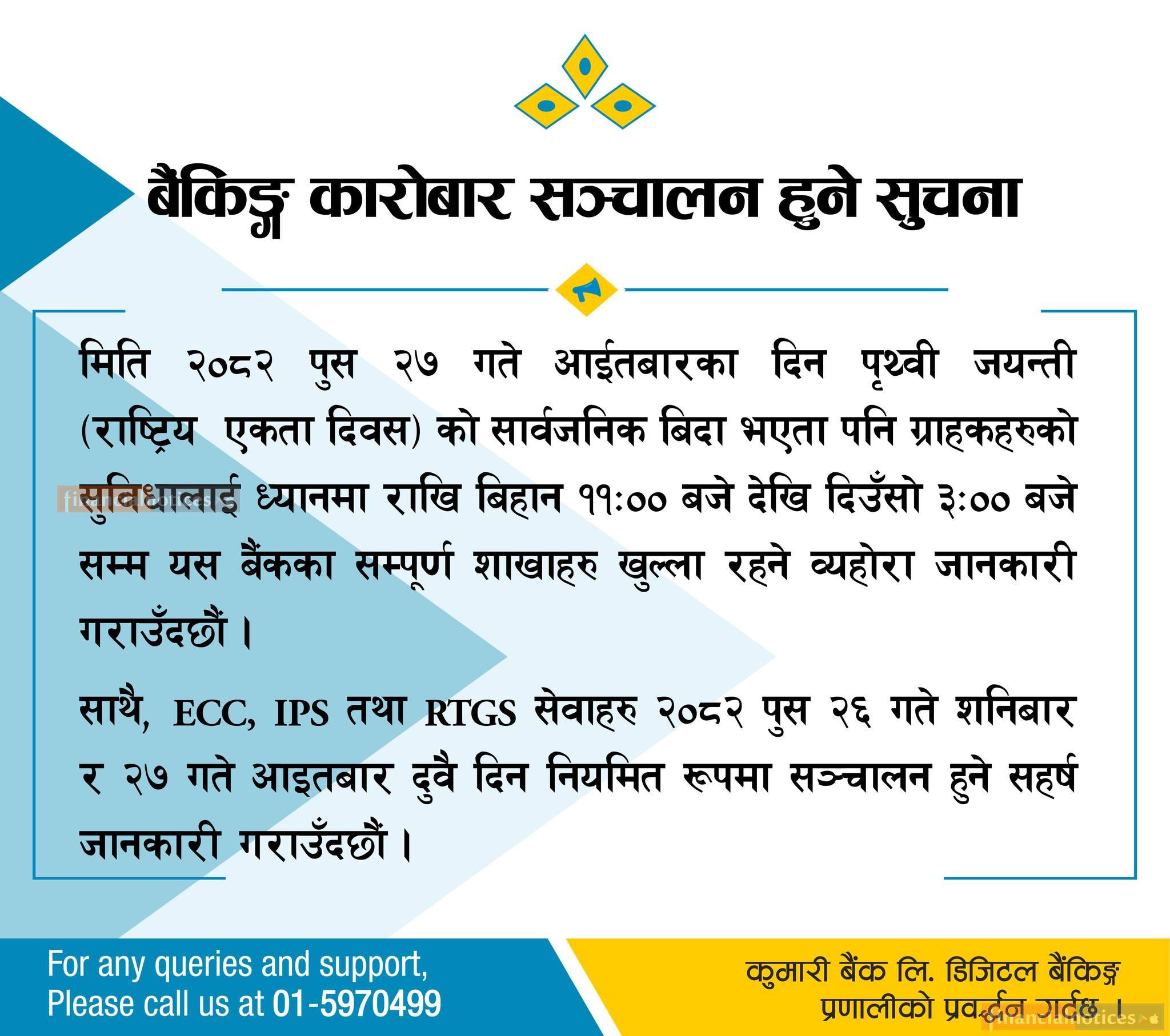 कुमारी बैंकको बैंकिङ्ग कारोबार सञ्चालन हुने सूचना