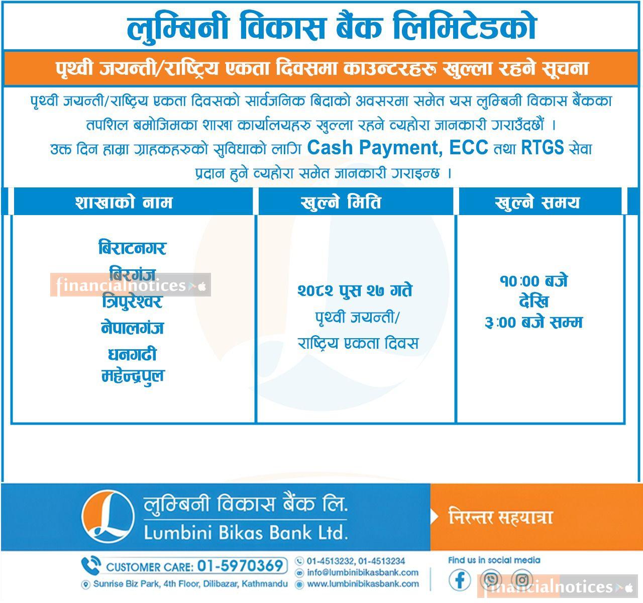 पृथ्वी जयन्ती र राष्ट्रिय एकता दिवसको दिन काउन्टरहरू खुल्ला रहने सूचना