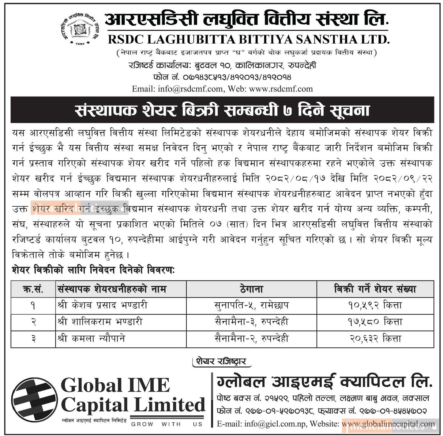 संस्थापक शेयर बिक्री सम्बन्धी ७ दिने सूचना