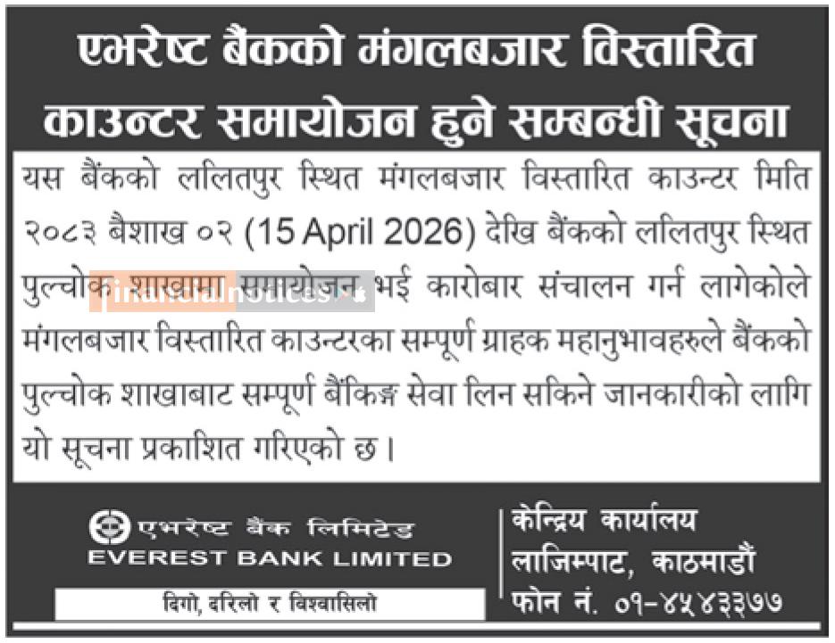 एभरेष्ट बैंकको विस्तारित काउण्टर समायोजन हुने सम्बन्धी सूचना