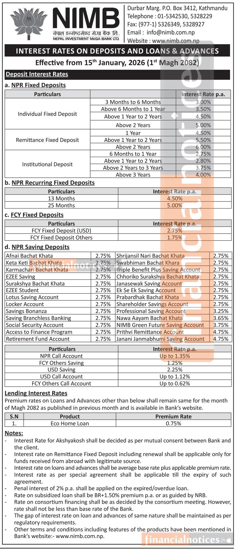 Nepal Investment Mega Bank announces new deposit interest rates effective from Magh 1, 2082
