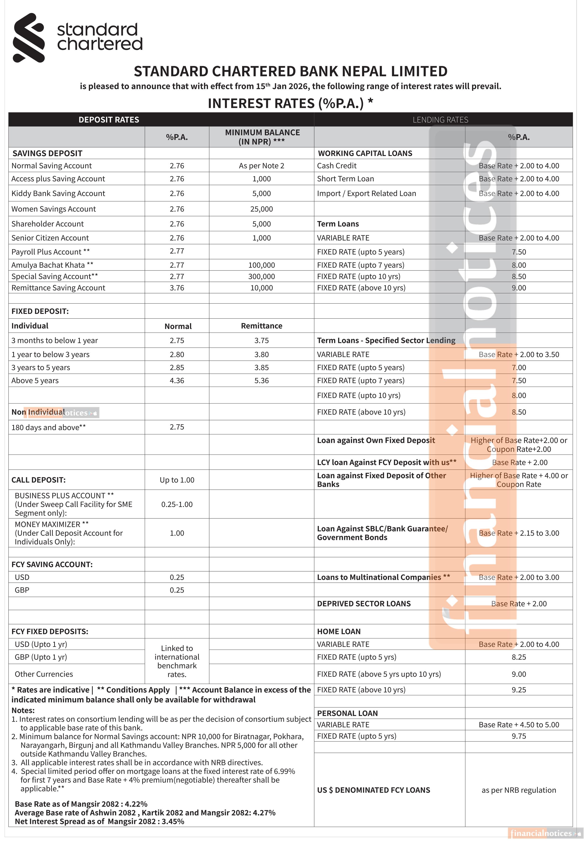 Standard Chartered Bank Nepal Limited has announced updated interest rates on deposits and loans. Savings accounts now offer 2.76%–3.76% p.a., while fixed deposits range from 2.75% to 5.36% depending on tenure and remittance status. Call deposits and FCY savings start from 0.25% p.a., with FCY fixed deposits linked to international benchmark rates. Lending rates include working capital loans at Base Rate +2.00%–4.00%, term loans 7.00%–9.25%, home loans up to 9.25%, and personal loans up to 9.75%. Rates are indicative, subject to NRB directives, and minimum balance requirements apply.