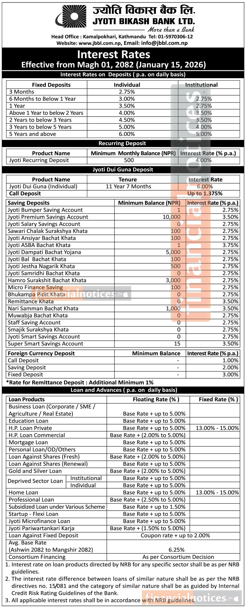 Jyoti Bikash Bank Ltd. has announced its revised interest rates effective from Magh 1, 2082 (January 15, 2026). Fixed deposit rates for individuals now range from 2.75% to 6.00% depending on tenure, while institutional deposits offer 2.75% to 5.00%. Recurring deposits require a minimum monthly balance of NPR 500 and earn 4.00% interest. The Jyoti Dui Guna Deposit, with a tenure of 11 years and 7 months, offers 6.00% interest. Savings account rates vary between 2.75% and 3.75%. Foreign currency deposits, including call, saving, and fixed deposits, yield 1.00% to 3.00% interest. Loan products carry floating rates linked to the bank’s base rate plus margin, while home and hire-purchase loans are fixed at 13–15%.