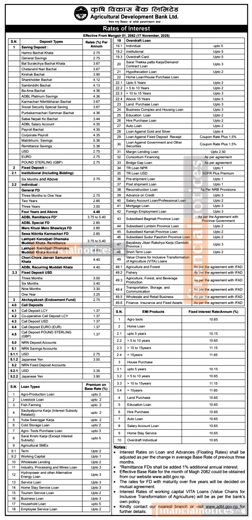 Agricultural Development Bank Ltd. has revised interest rates effective Magh 1, 2082. Savings accounts now offer 2.75%–5.36%, fixed deposits 2.75%–4.40%, and USD deposits 2.75%–3.50%. Loan products, including home, auto, education, and SME loans, carry rates from 10.15%–11.65% depending on tenure. Overdrafts, specialized loans, and remittance FDs are linked to base rates or agreements.