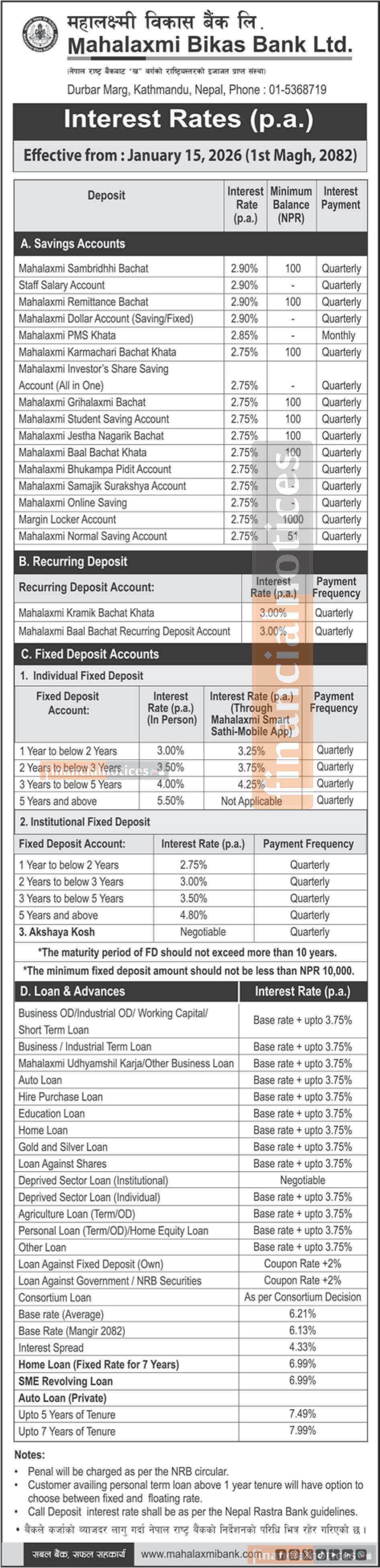 Mahalaxmi Bikas Bank Announces Updated Interest Rates Effective 1st Magh, 2082 -