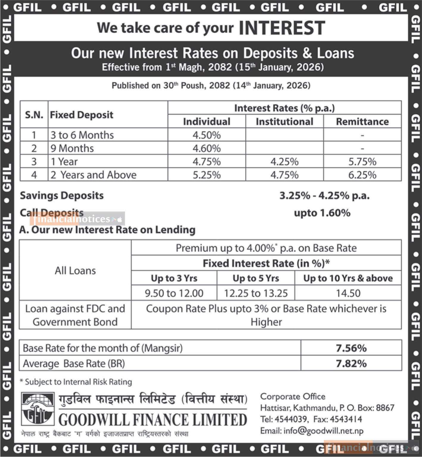 New Interest Rates of Goodwill Finance Effective from 1st Magh 2082