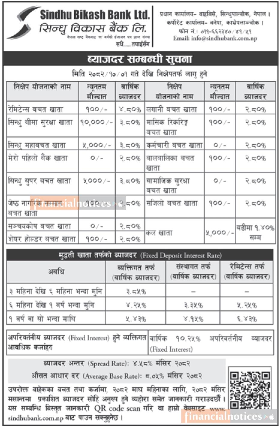 New Interest Rates of Sindhu Bikas Bank Effective from 1st Magh 2082