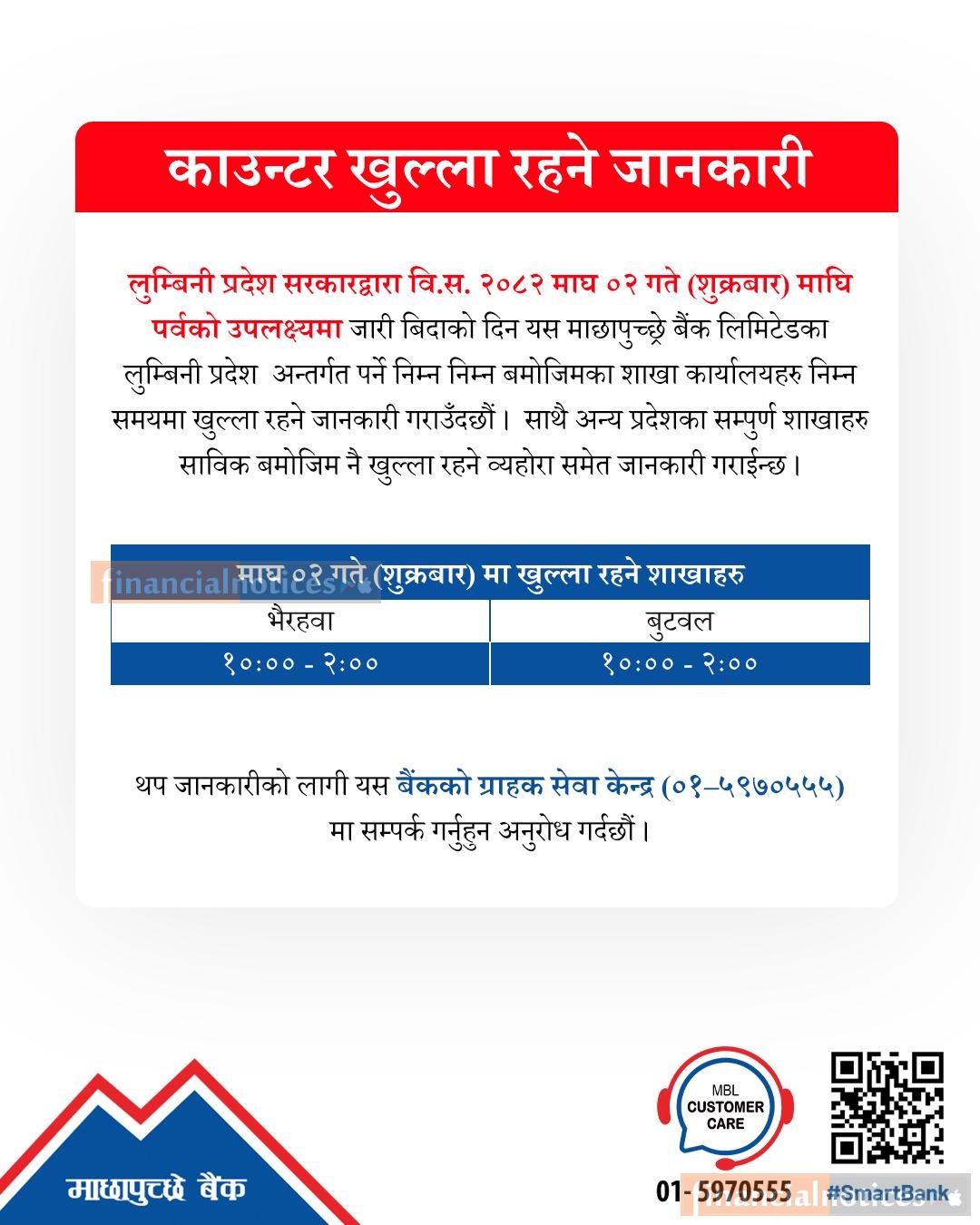 माछापुच्छ्रे बैंकको विभिन्न काउन्टरहरु खुल्ला रहने सम्बन्धी सूचना