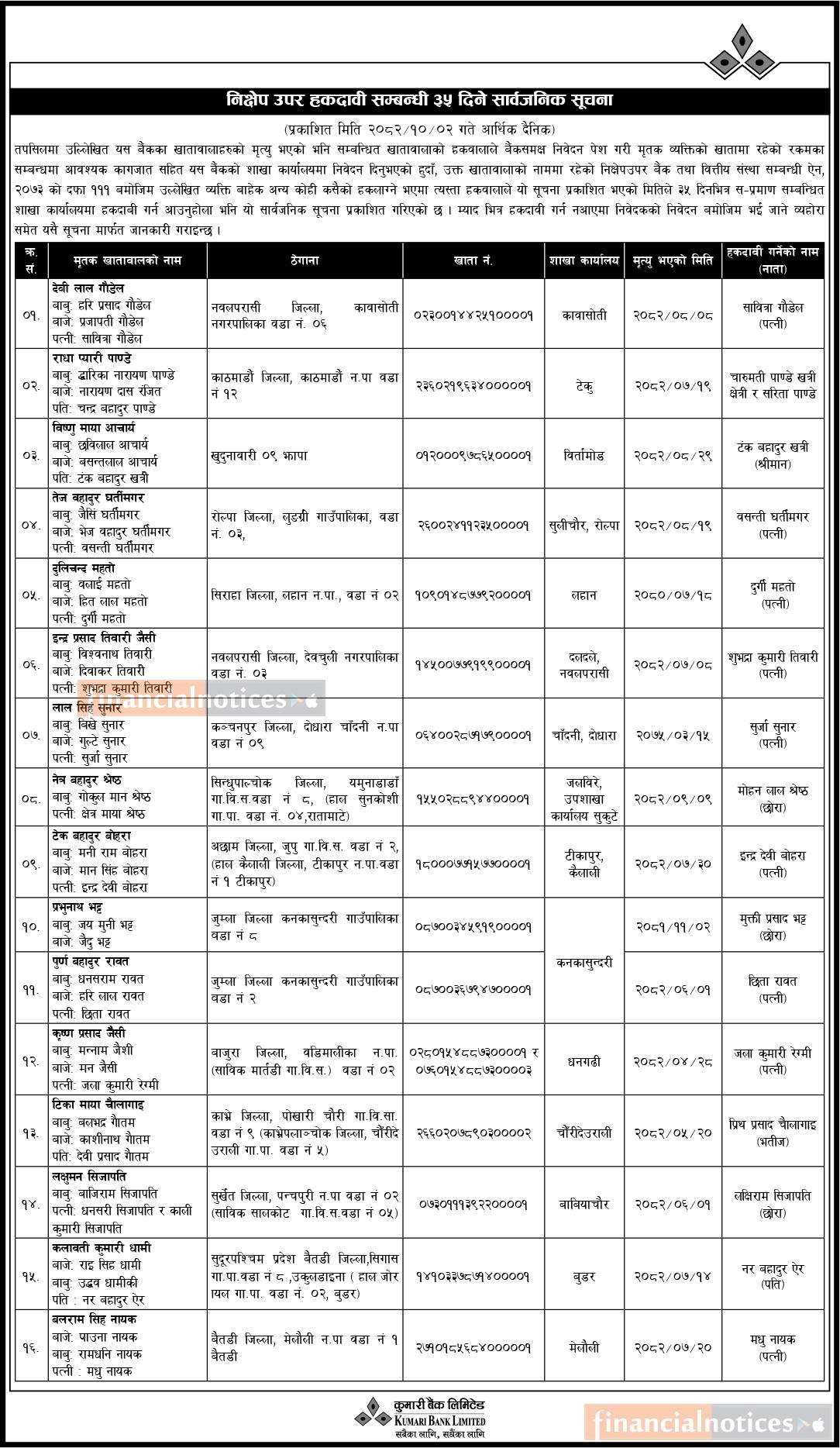 कुमारी बैंकको निक्षेप उपर हकदावी सम्बन्धी ३५ दिने सार्वजनिक सूचना -