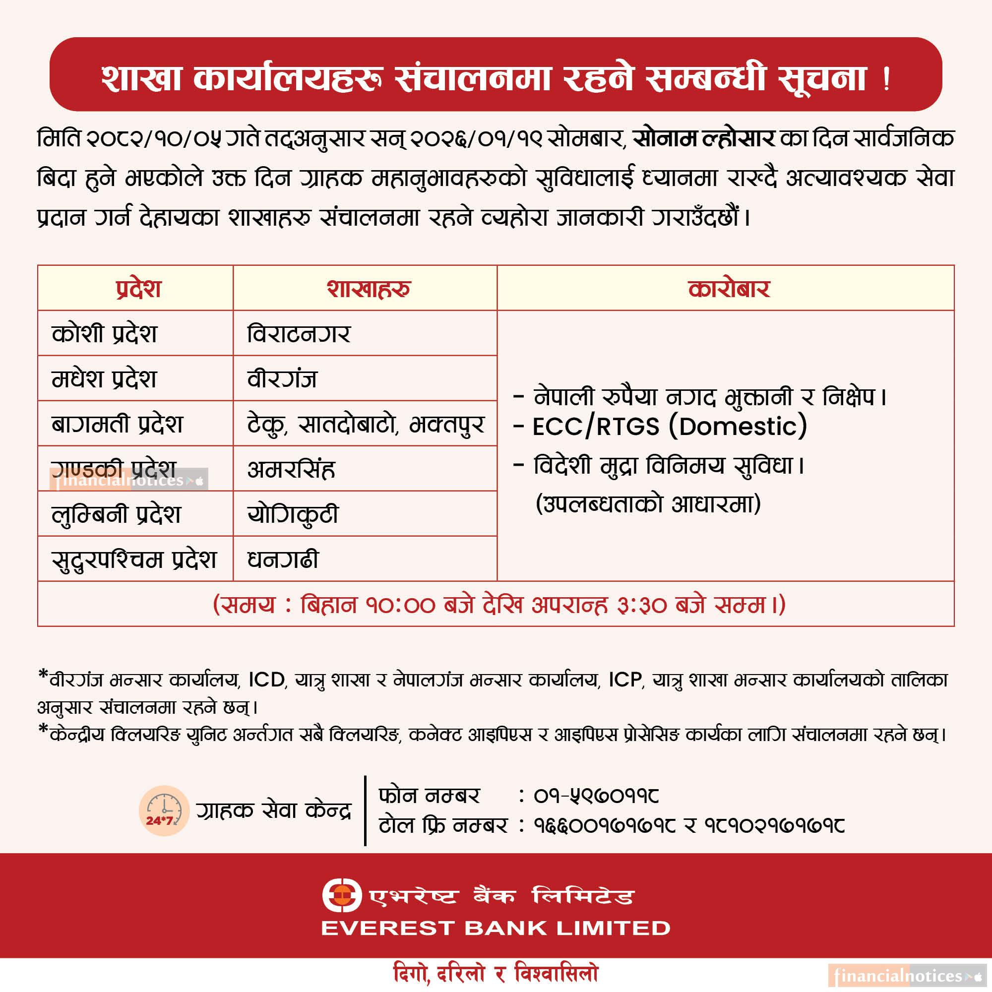 एभरेष्ट बैंककाे शाखा कार्यालयहरु संचालनमा रहने सम्बन्धी सूचना