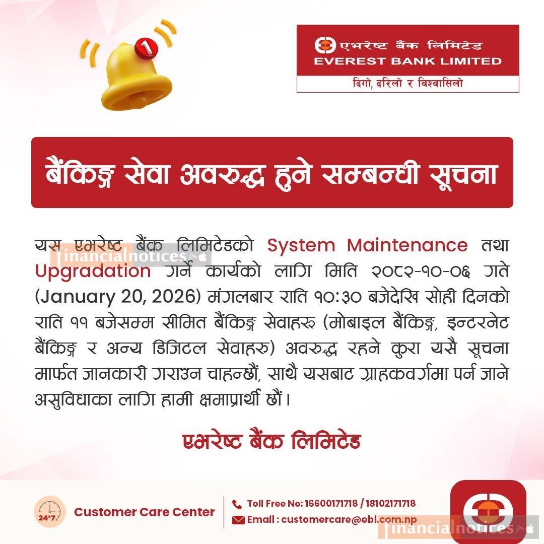 बैंकिङ्ग सेवा अवरुद्ध हुने सम्बन्धी एभरेष्ट बैंकको सूचना -
