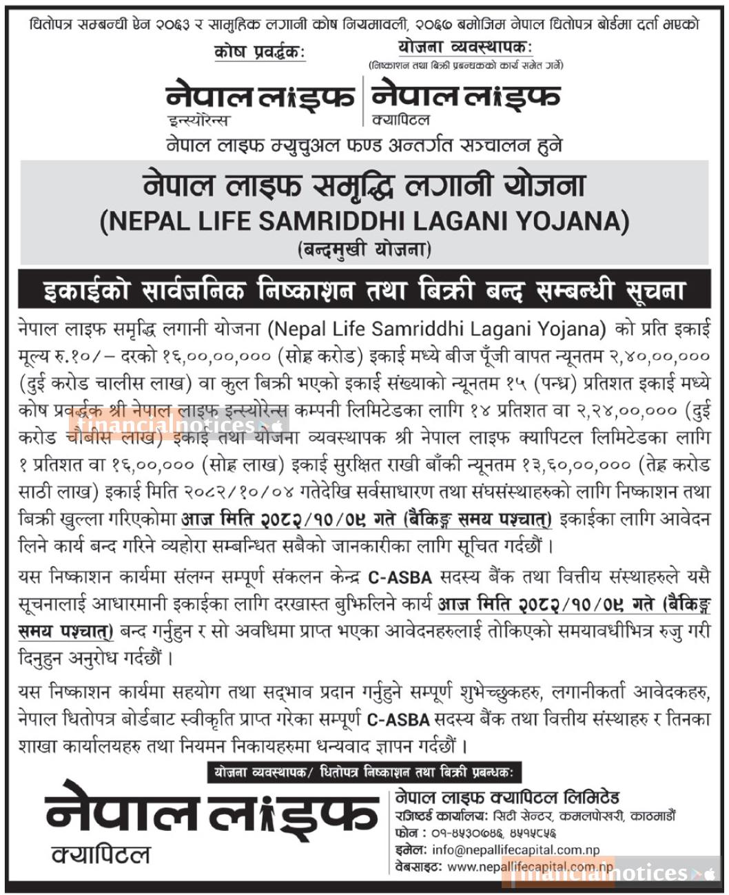 नेपाल लाइफ समृद्धि लगानी योजनाको इकाई खरिदका लागि आवेदन दिने आज अन्तिम दिन सम्बन्धी सूचना