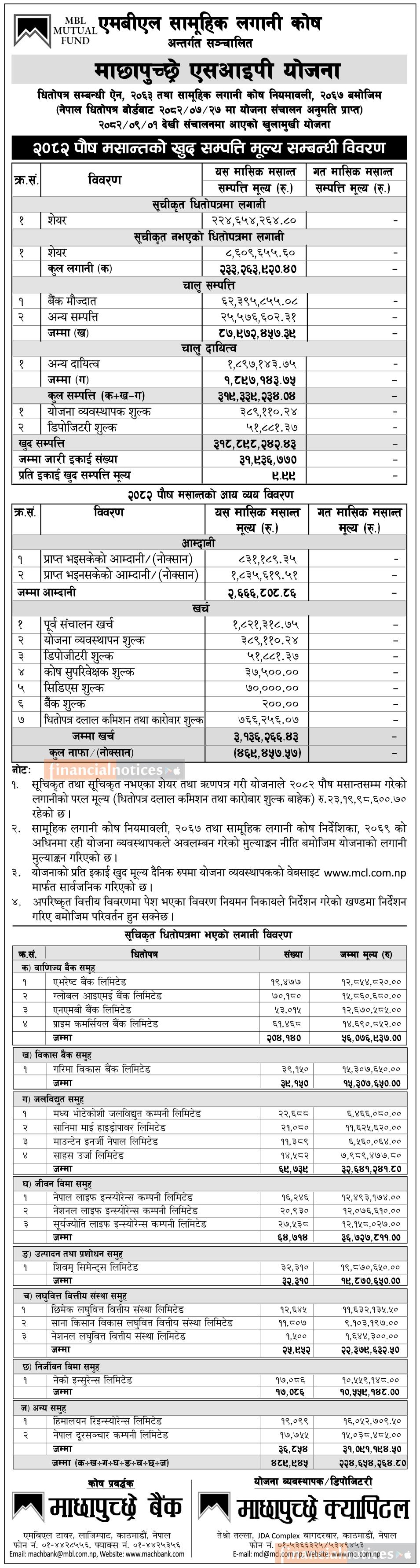 Machhapuchchhre Capital has published “Machhapuchchhre SIP Yojana” Net Asset Value till Poush, 2082