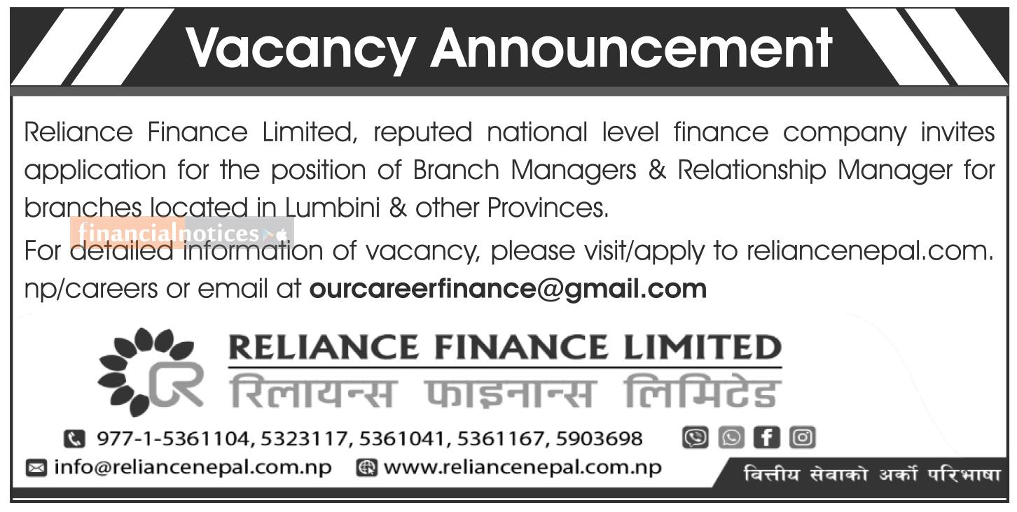 Reliance Finance Limited has invited applications for the positions of Branch Manager and Relationship Manager for its branches located in Lumbini Province and other provinces. The nationally reputed finance company is seeking qualified and experienced professionals to fill these vacant posts.