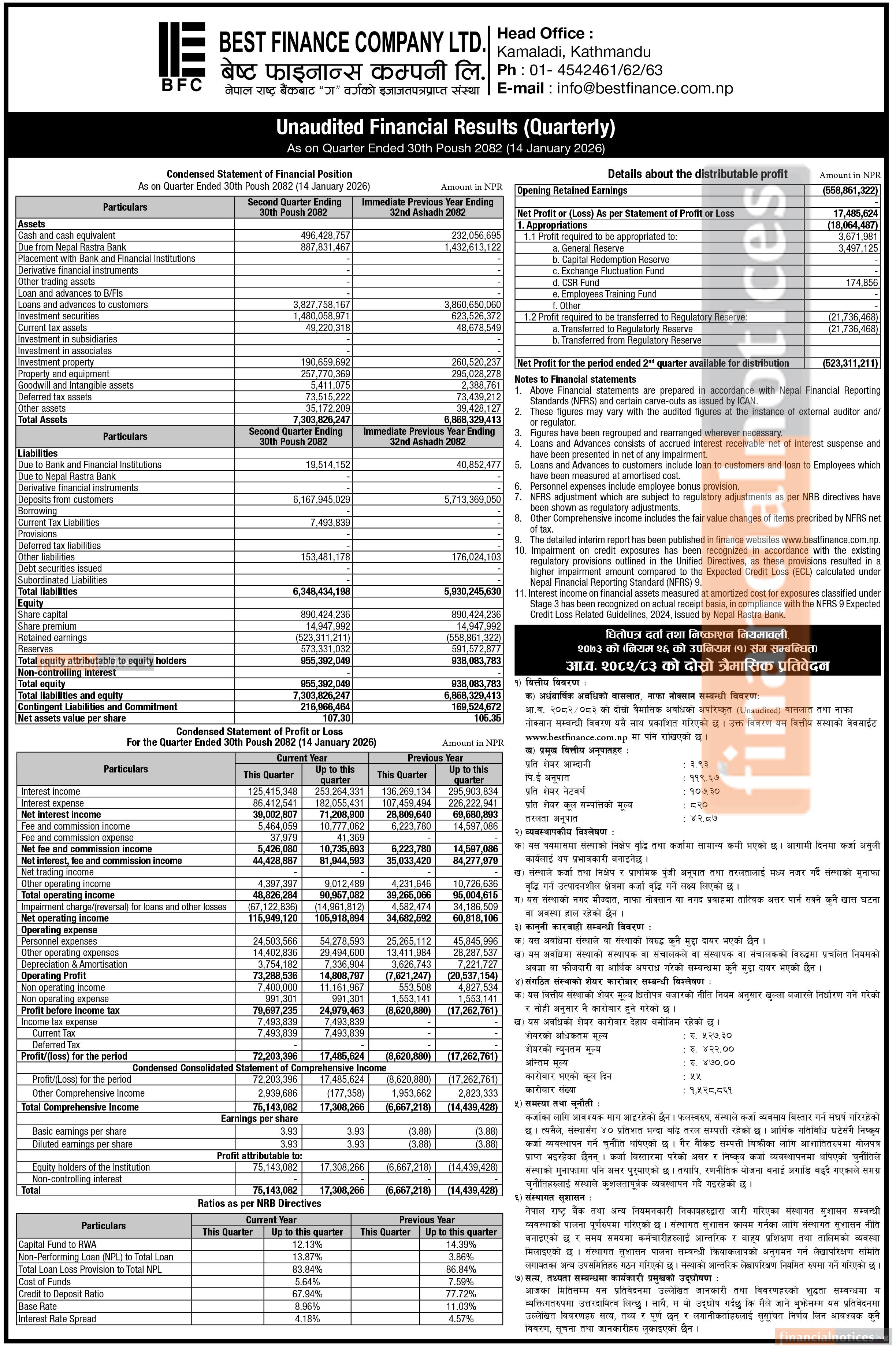 Best Finance Company has posted a net profit of Rs 17.48 million and published its 2nd quarter