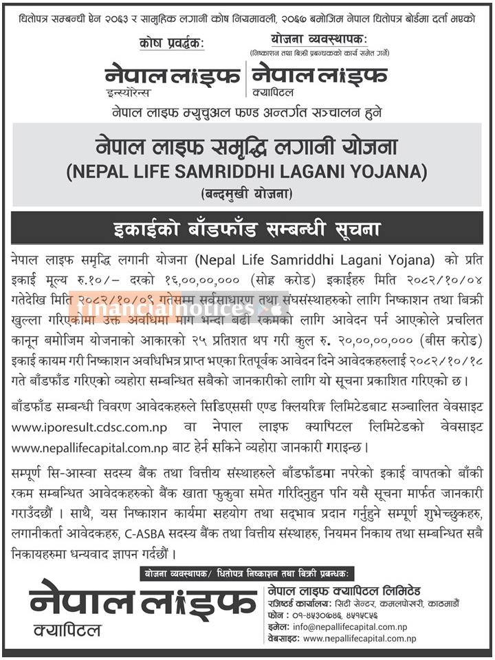 नेपाल लाइफ समृद्धि लगानी योजनाको इकाई बाँडफाँड सम्बन्धी सूचना प्रकाशित