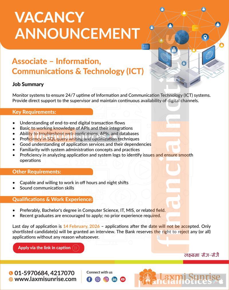 Laxmi Sunrise Bank Limited has announced a vacancy for the position of Associate – Information, Communications & Technology (ICT). The bank is seeking motivated candidates to support and monitor its ICT systems to ensure 24/7 system uptime and the continuous availability of digital channels.