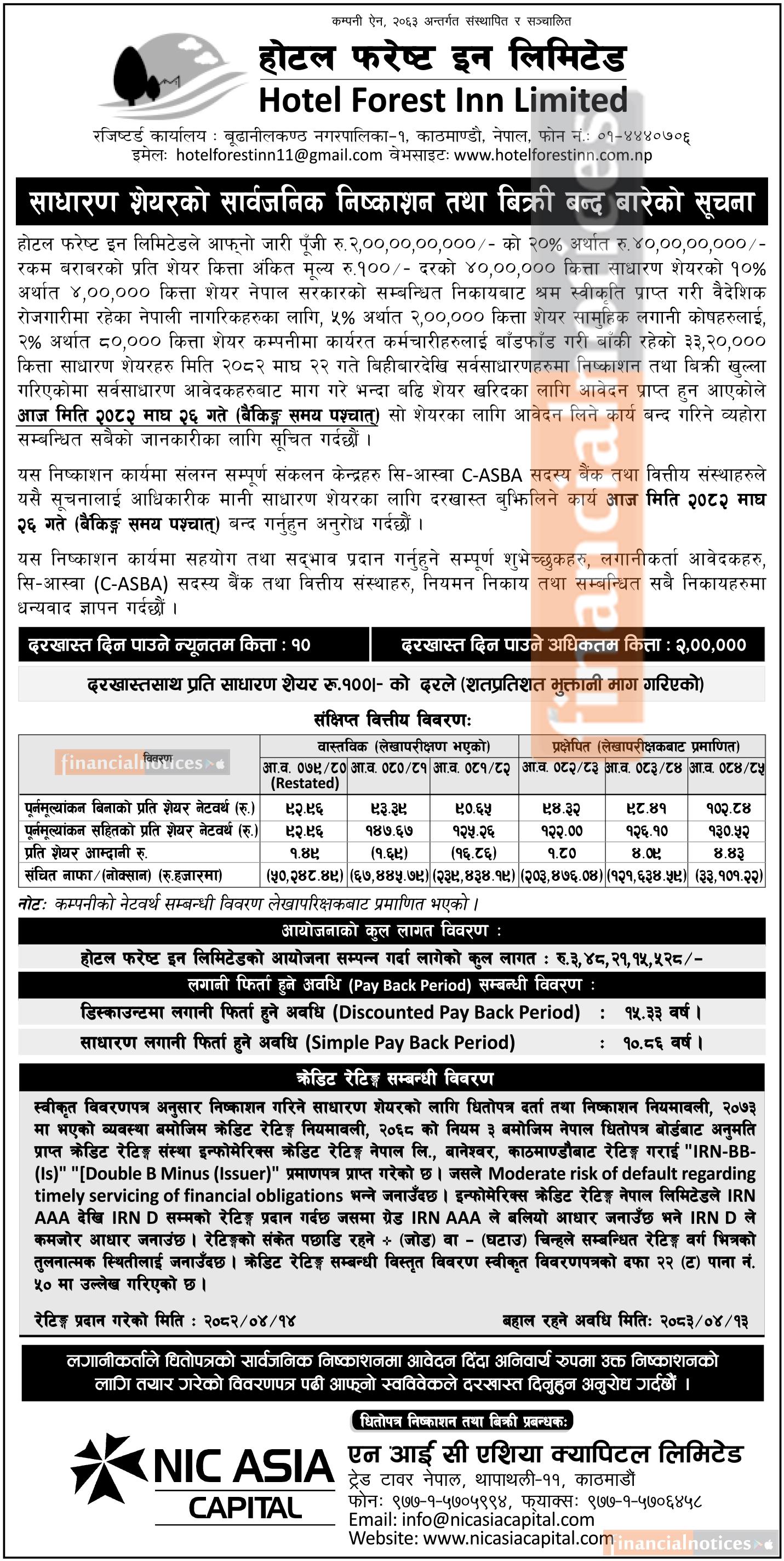 होटल फरेष्ट इनको आईपीओमा आवेदन दिने आज अन्तिम दिन सम्बन्धी सूचना