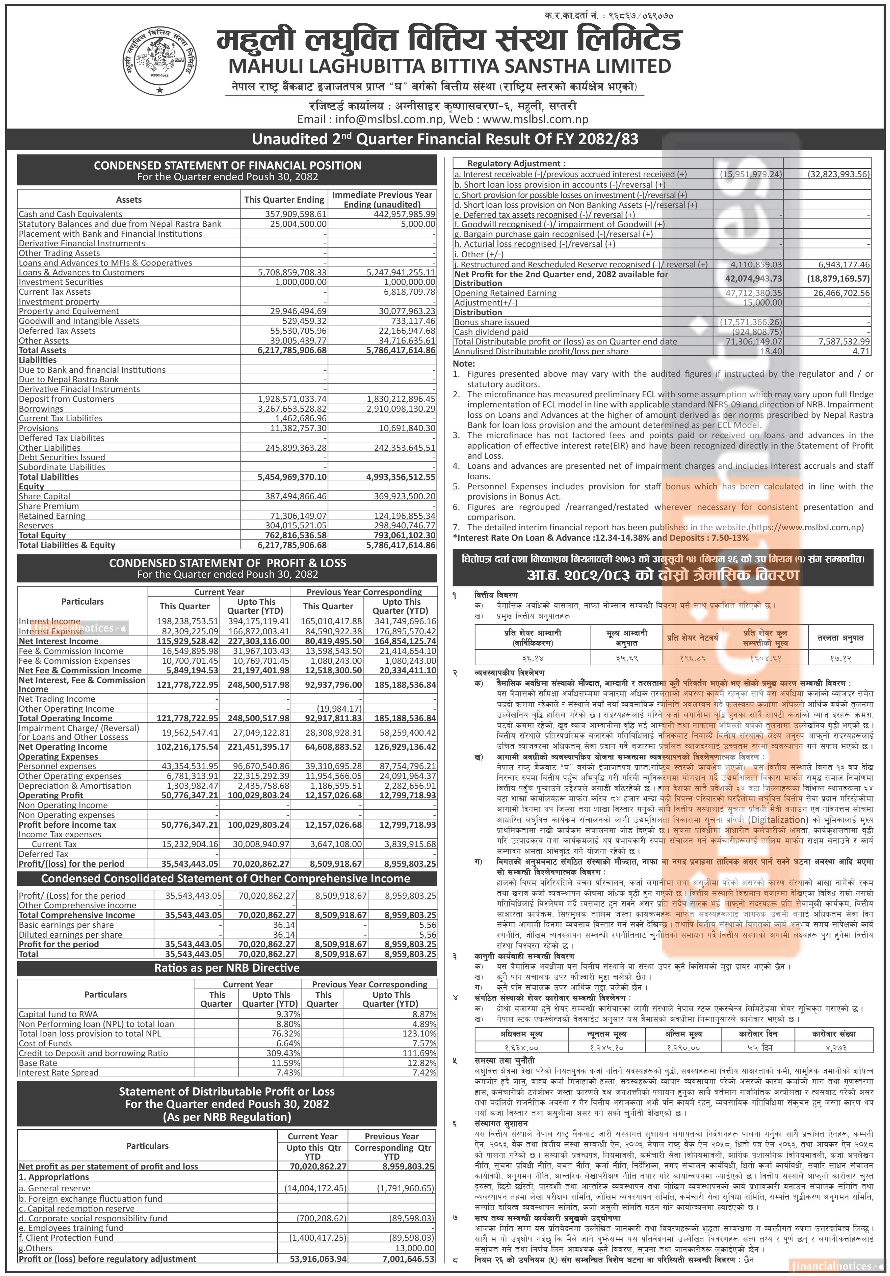 Mahuli Laghubitta has posted a net profit of Rs 70.02 million and published its 2nd quarter