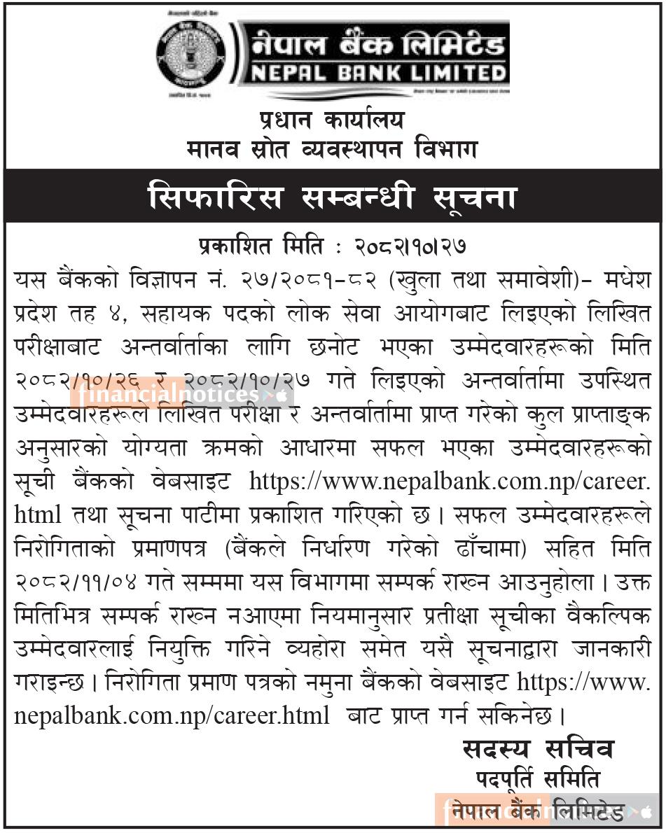 नेपाल बैंकमा सहायक पदका लागि सिफारिस उम्मेदवारको अन्तिम नतिजा सार्वजनिक