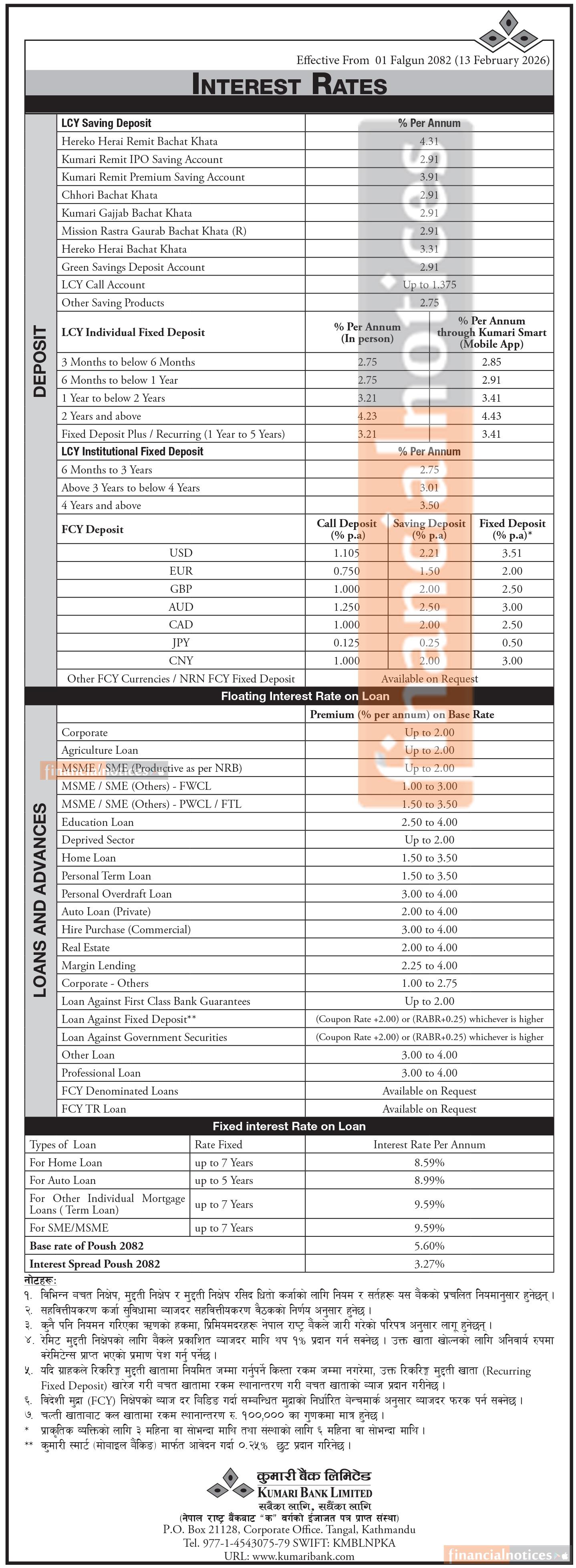 Kumari Bank Limited informs that the new deposit interest rates will be effective from 1st Falgun