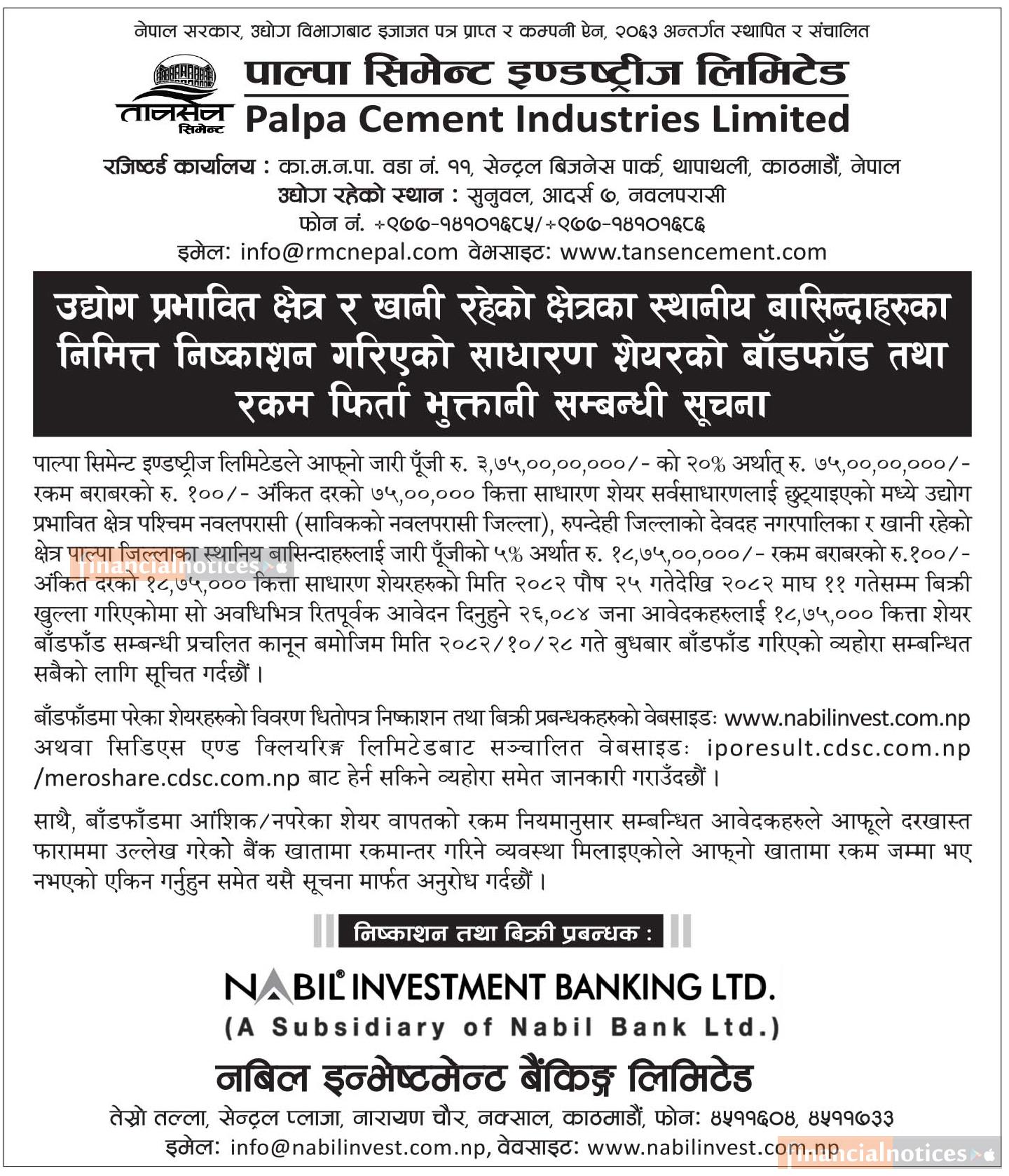 स्थानिय बासिन्दाहरुका लागि जारी पाल्पा सिमेन्टको आईपीओ बाँडफाँड सम्बन्धी सूचना