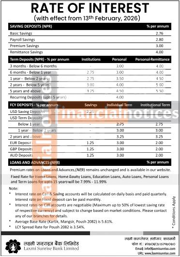Laxmi Sunrise Bank Publishes New Interest Rates Effective from Falgun 2082 -