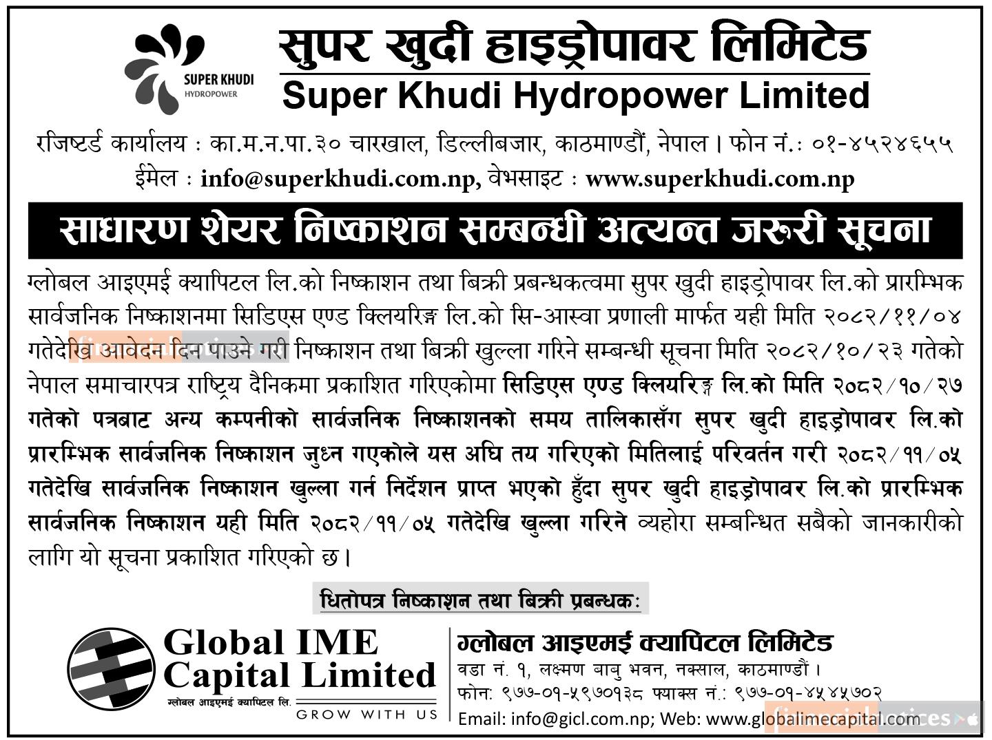 सुपर खुदी हाइड्रोपावरको आईपीओ निष्काशन मिति परिवर्तन सम्बन्धी सूचना