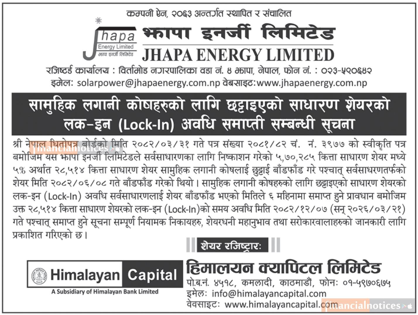 झापा इनर्जी लिमिटेडको सामूहिक लगानी कोषतर्फको साधारण शेयरको लक–इन अवधि समाप्त सम्बन्धी सूचना