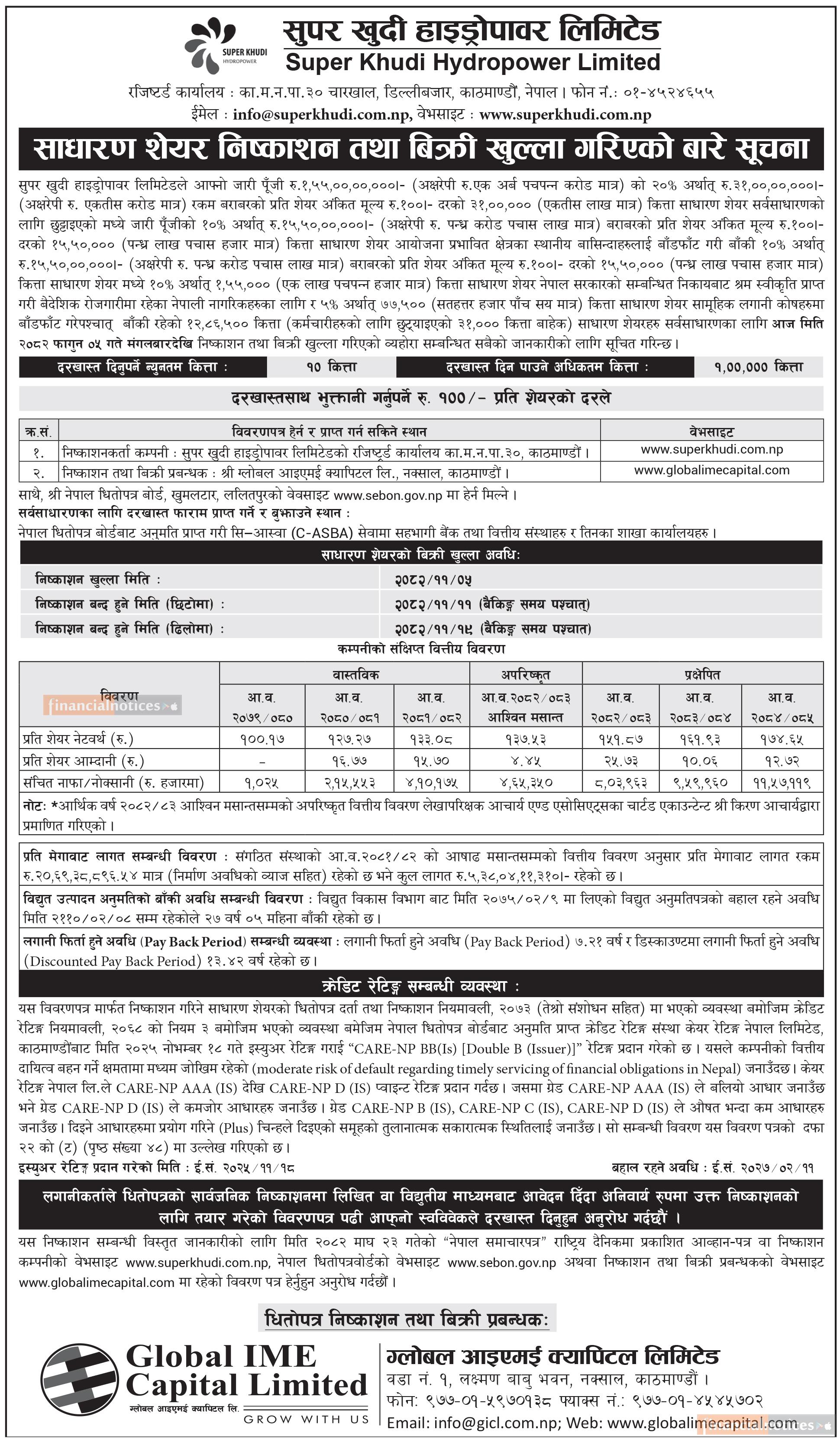 आजदेखि सुपर खुदी हाइड्रोपावरको दोस्रो चरणको आईपीओ बिक्री सुरु सम्बन्धी सूचना