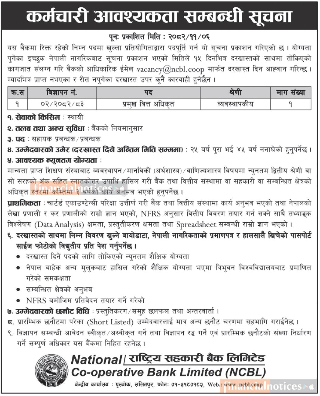 Kathmandu – National Cooperative Bank Limited (NCBL) has published a vacancy notice for the post of Chief Finance Officer under the managerial category. The bank is seeking to fill one permanent position through open competition.