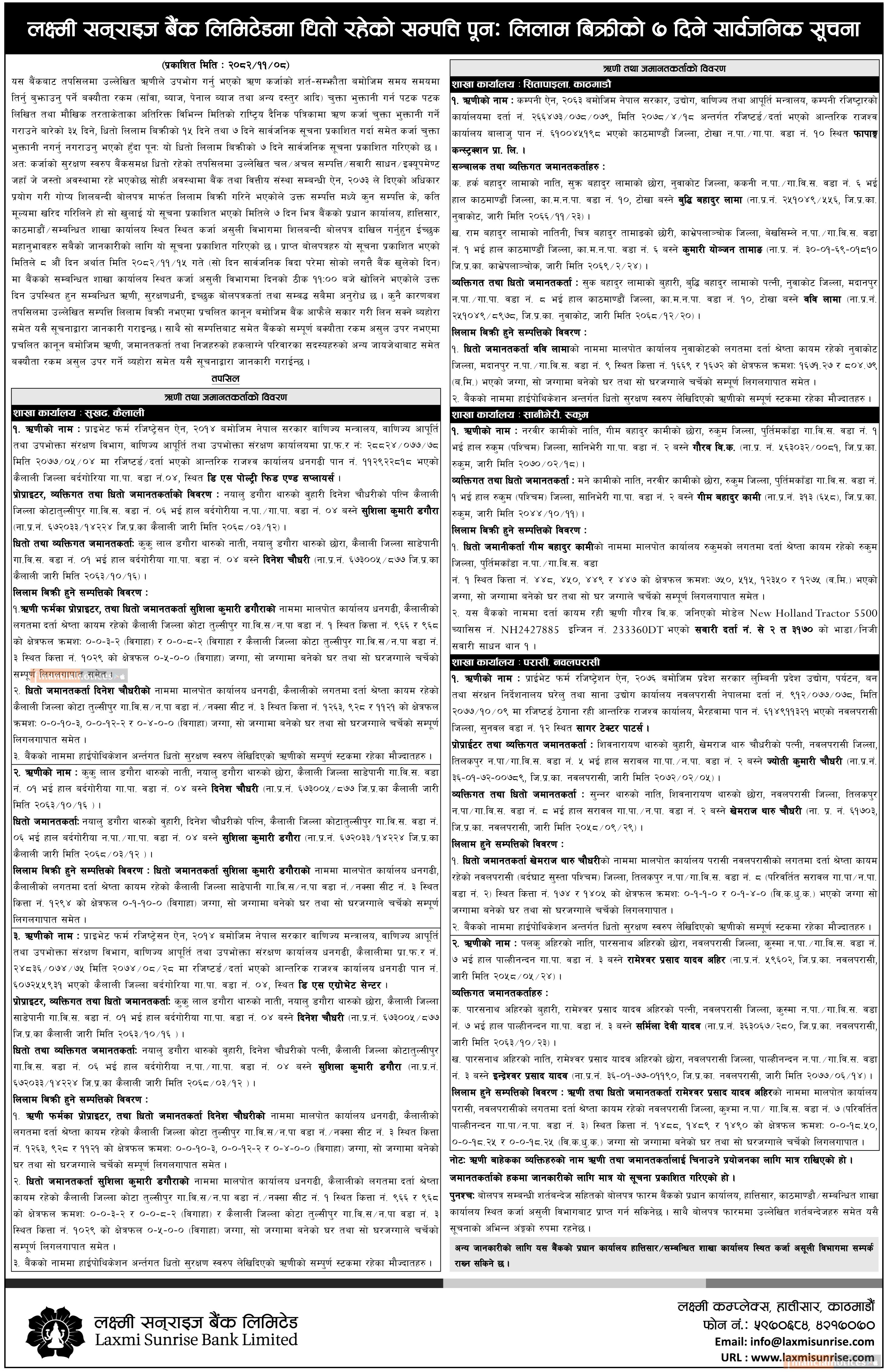 लक्ष्मी सनराइज बैंकमा धितो रहेको सम्पत्ति लिलाम बिक्रीको १५ दिने सार्वजनिक सूचना