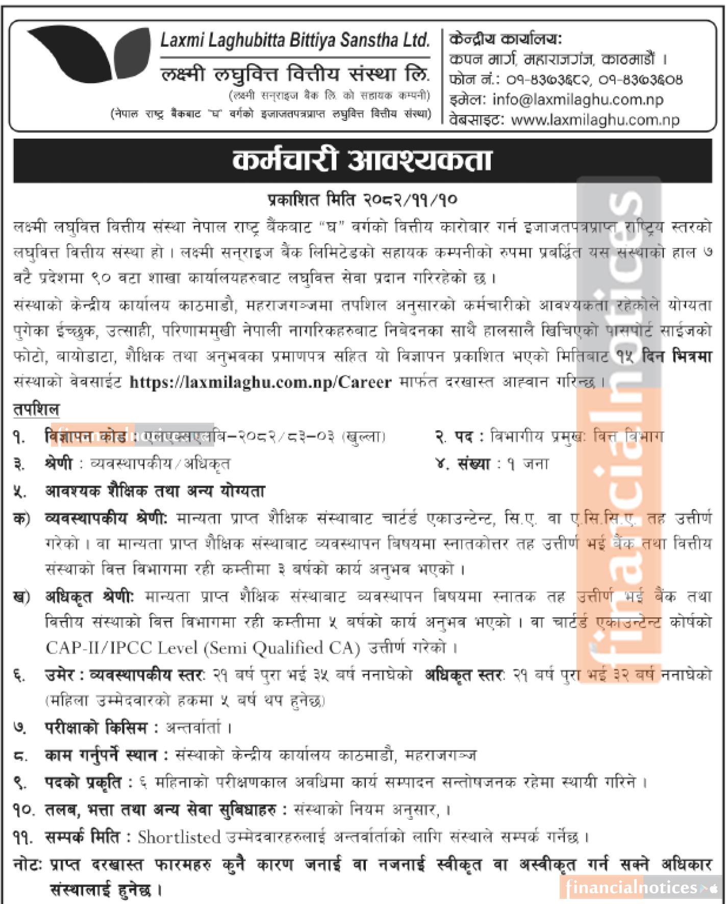 Kathmandu – Laxmi Laghubitta Bittiya Sanstha Ltd. has published a vacancy notice calling applications from qualified and competent Nepali citizens for the position of Departmental Head – Finance Department at its central office in Maharajgunj, Kathmandu.