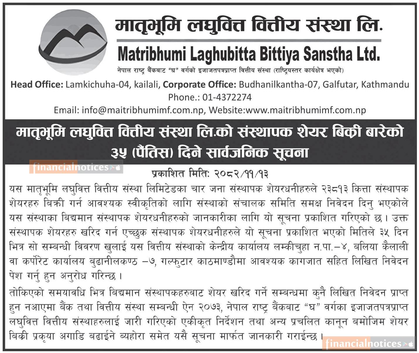 मातृभूमि लघुवित्तमा संस्थापक शेयर बिक्रीको घोषणा, शेयरधनीलाई ३५ दिनभित्र आवेदन आह्वान